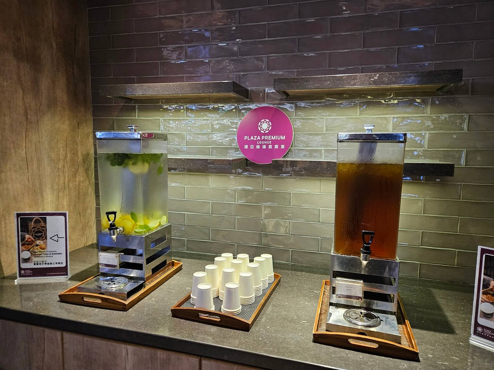 點餐櫃檯旁提供檸檬水以及原萃綠茶。