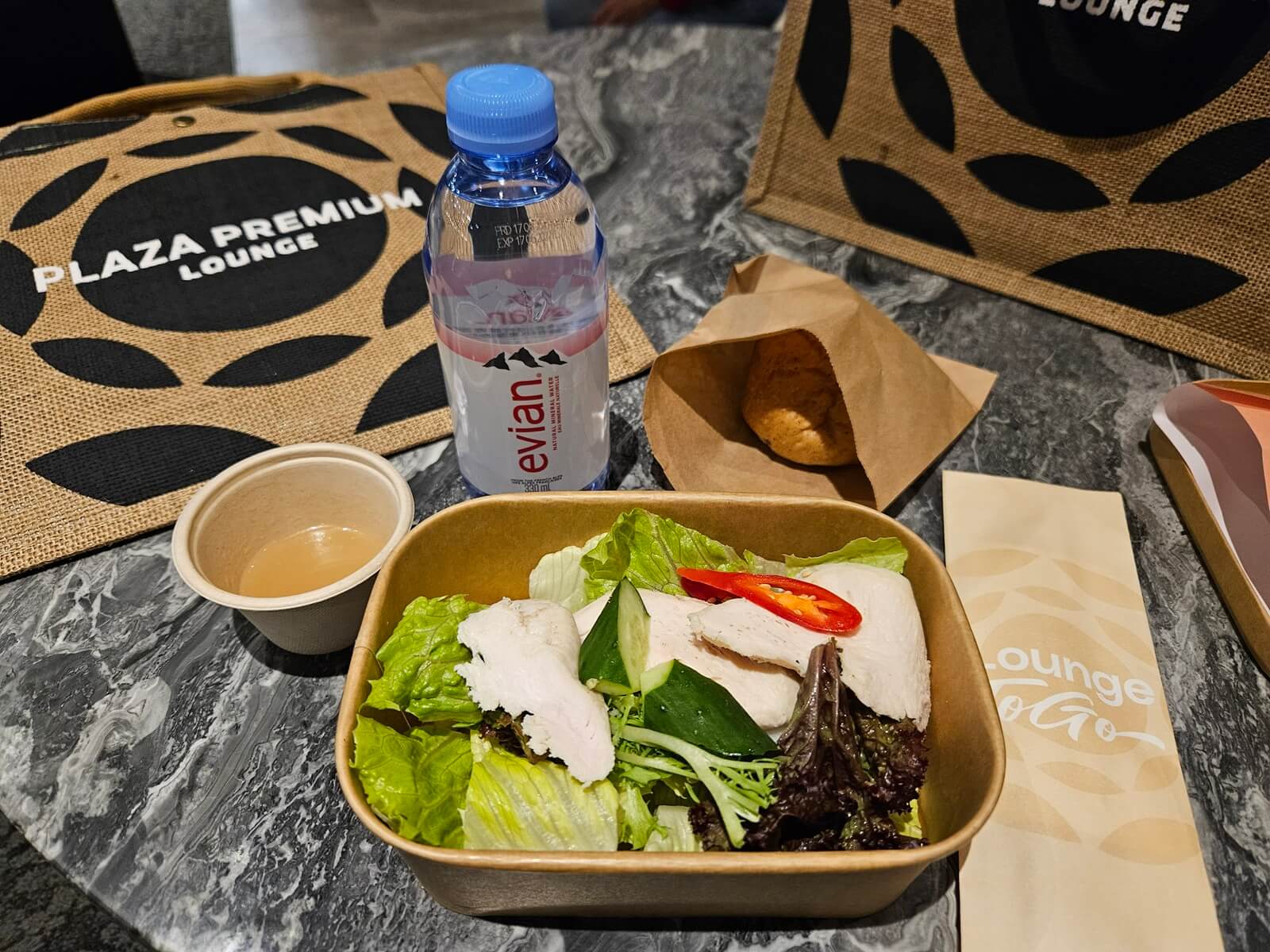 想到等等還有兩餐飛機餐,我點了鹹水雞風味的沙拉。內容包含沙拉本身、葡萄乾麵包、一瓶依雲水,跟一個環亞貴賓室的提袋。