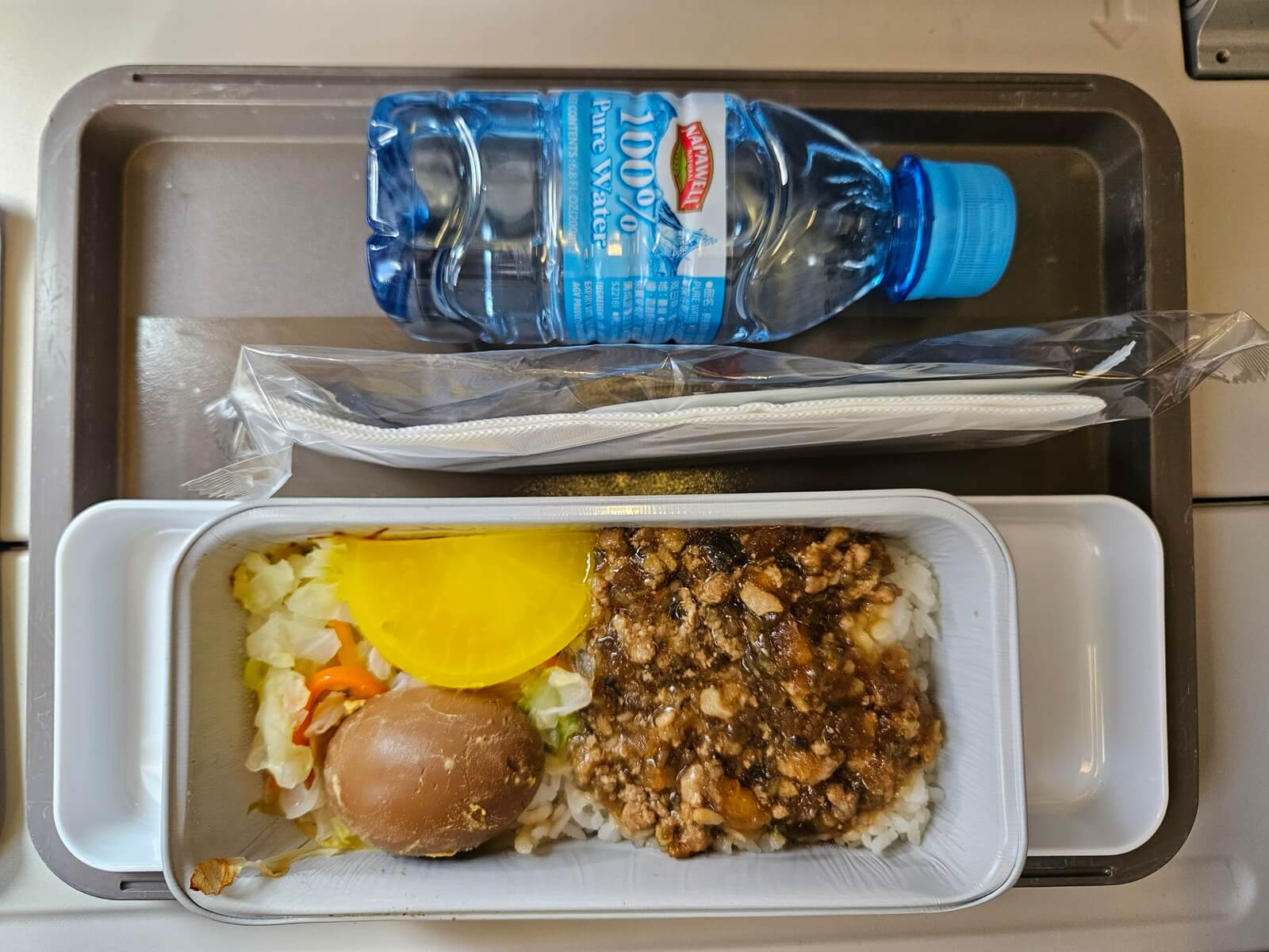 而很快,我拿到了本次航班的飛機餐滷肉飯(其實應該是瓜子雞肉飯)。飯的溫度加熱的剛剛好,微酸的醬汁爽口下飯,至於黃色的醃蘿蔔,則是酸到不行🤣