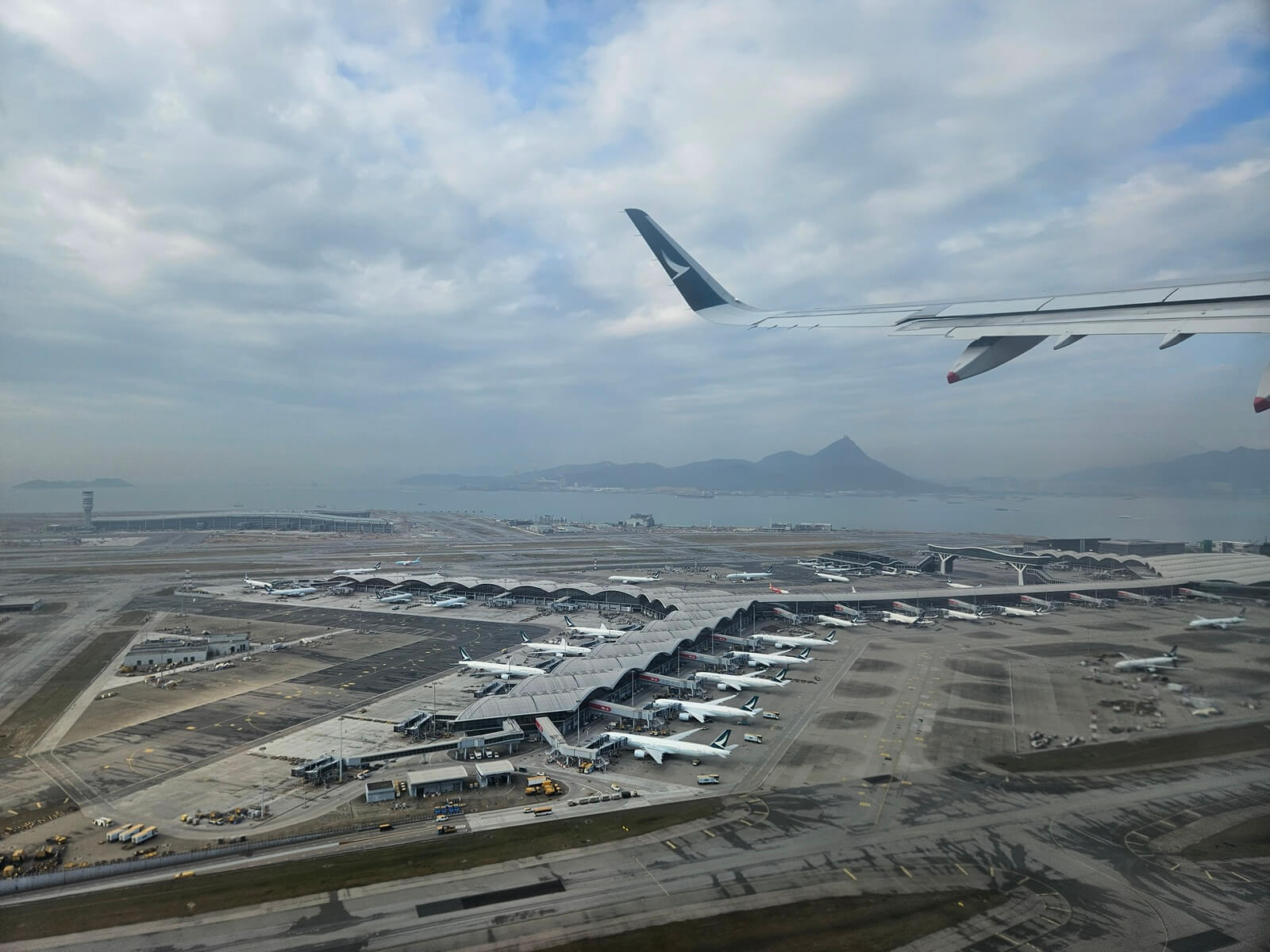 而為了在一個小時 20 分鐘的轉機時間,吃上一口心心念念的港式蛋撻,下機後我們直接前往近 40 號登機門的轉機處進行檢查。通過檢查、上到離境層,感覺圍繞著大嶼山的雲霧,有比剛抵達時散開一些。