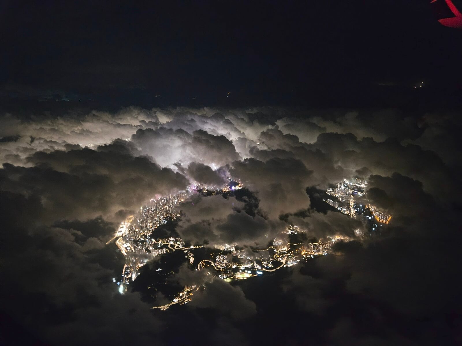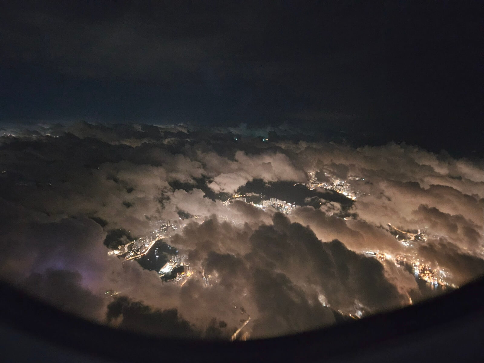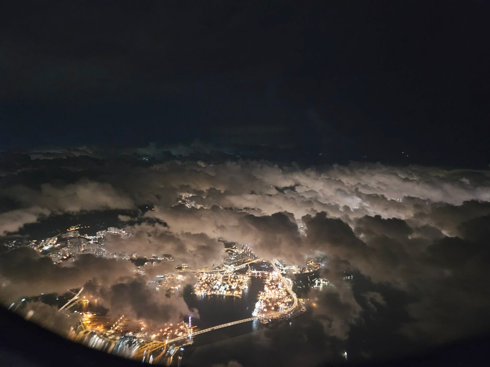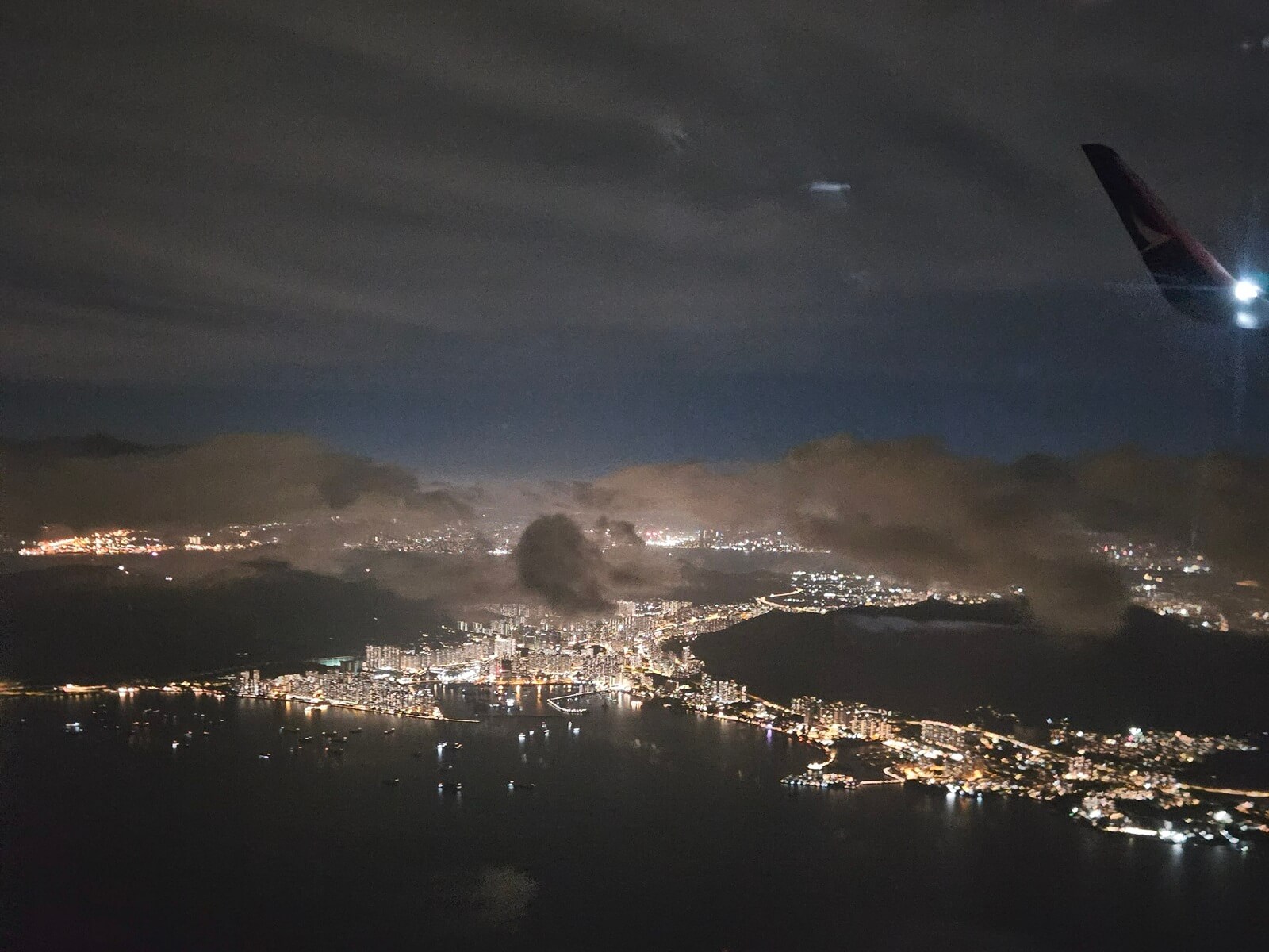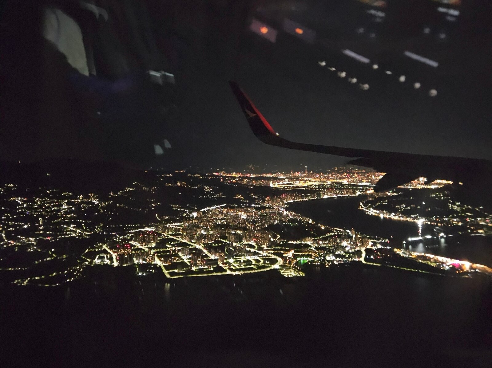 在青衣、荃灣上空右轉時,大部分夜空已被雲層覆蓋,僅能從縫隙間窺見璀璨的香港夜景。