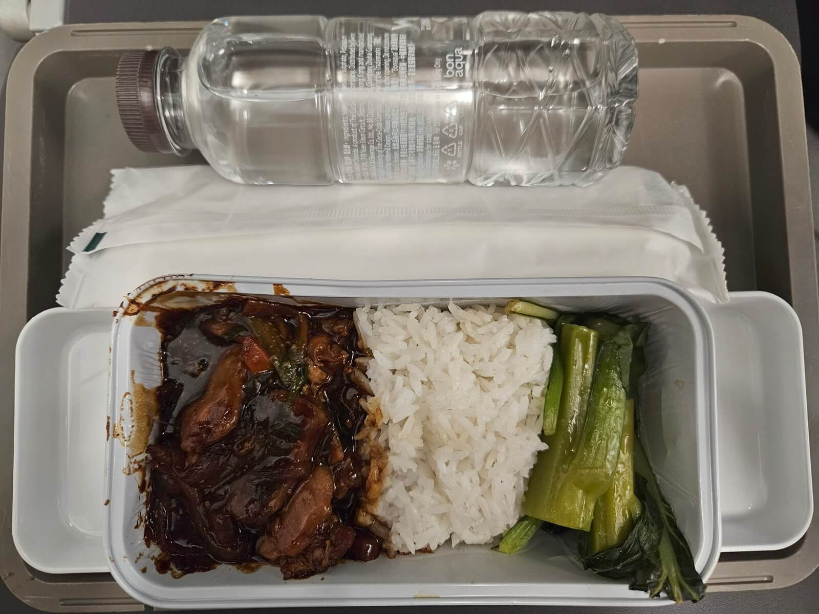 這天的飛機餐是去年遇到過的雞肉飯,雞肉的醬汁跟印象中一樣十分之鹹,然後明顯加熱過度,鋁箔蓋子燙到不行。