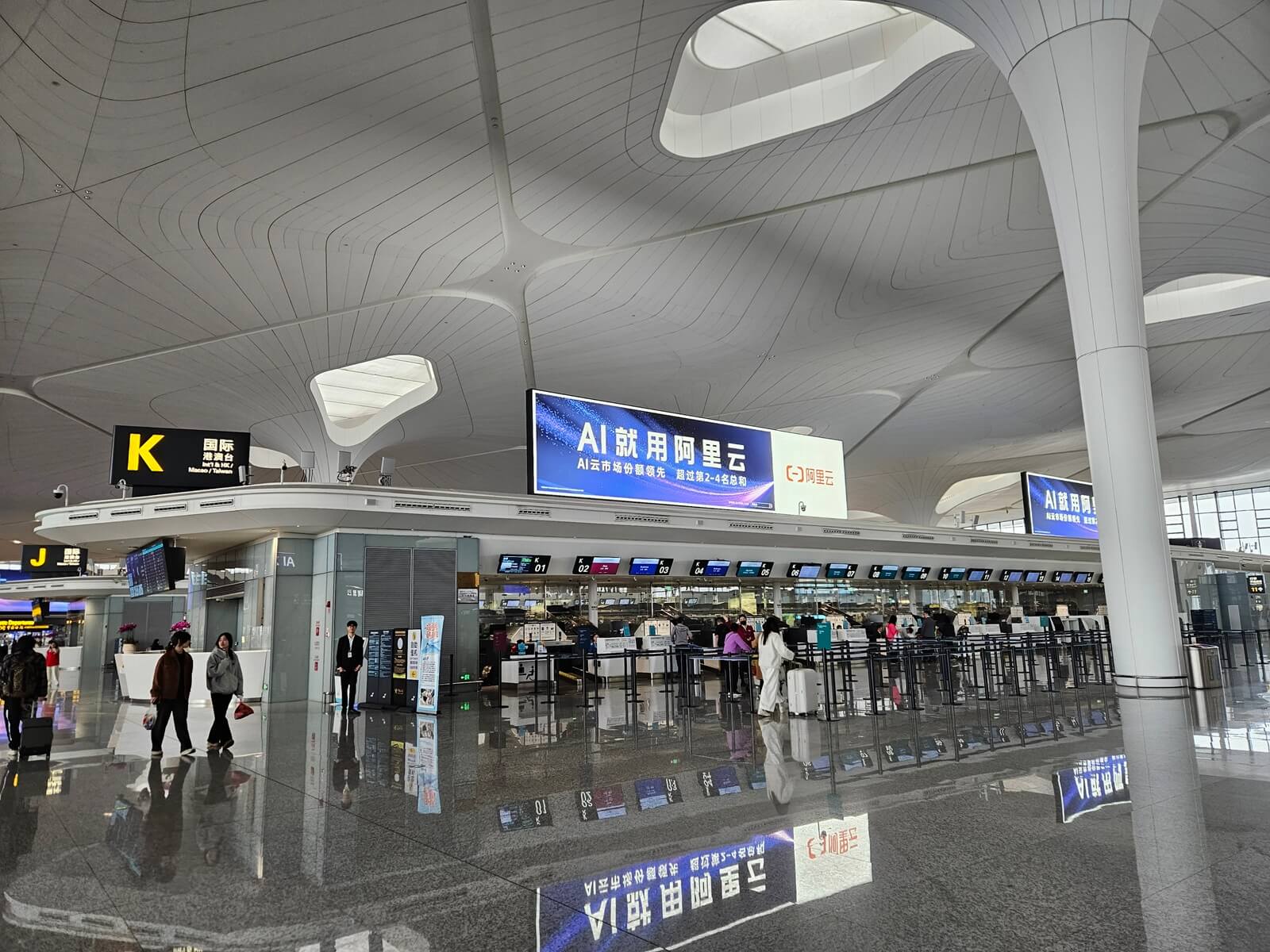 和去年五月從廈門出發時一樣(請見飛行紀錄),進入航廈之前要進行防爆檢查。國泰航空使用的 K 行段位在第四航廈國際、港澳台出發層的中間區域,地勤由當地的地勤公司代理。