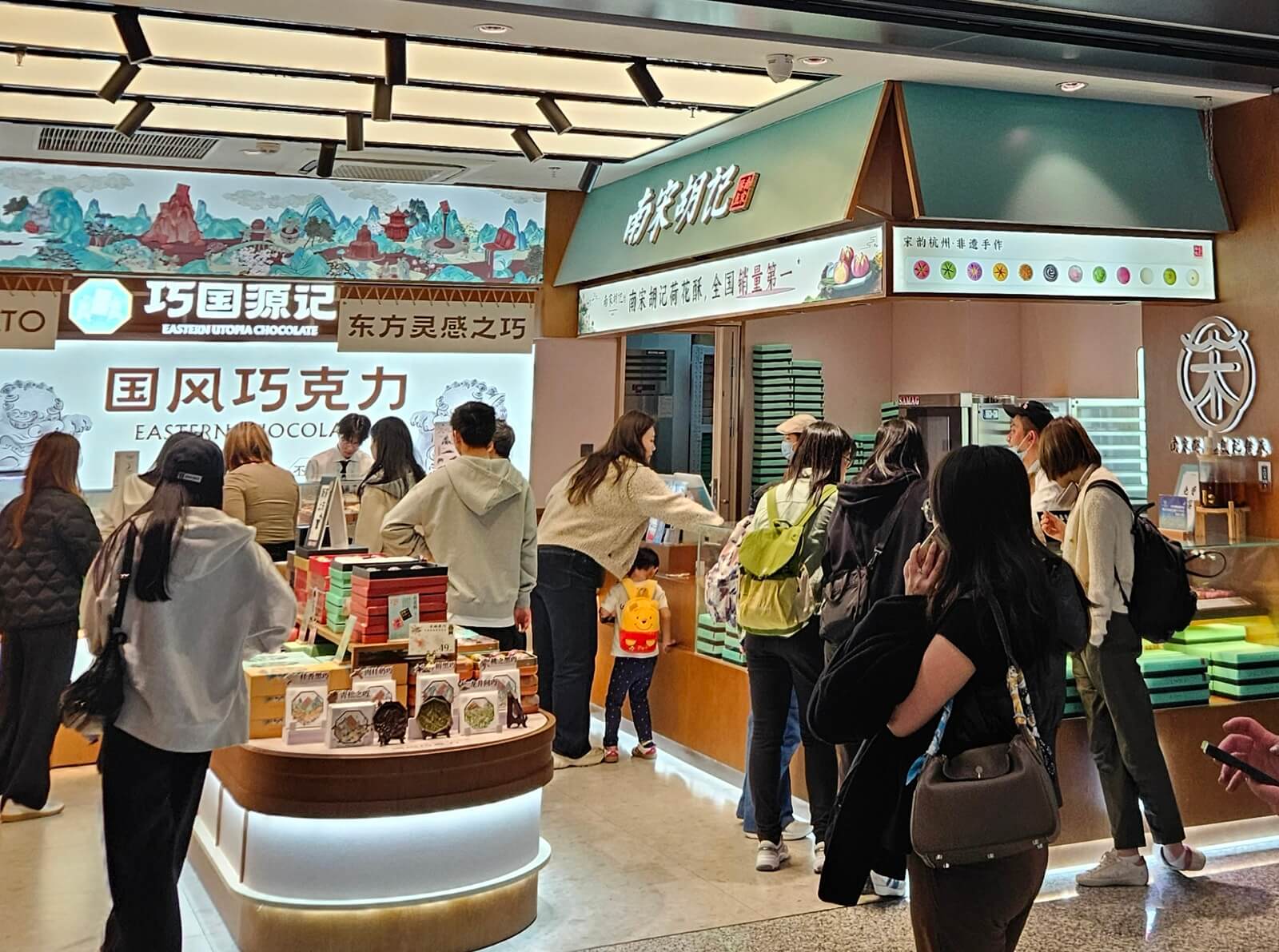 進到管制區,對面樓上有德克士炸雞與一中一西兩間餐廳。樓下則是小小一條商店街,其中有杭州知名餅店「南宋胡記」以及星巴克。