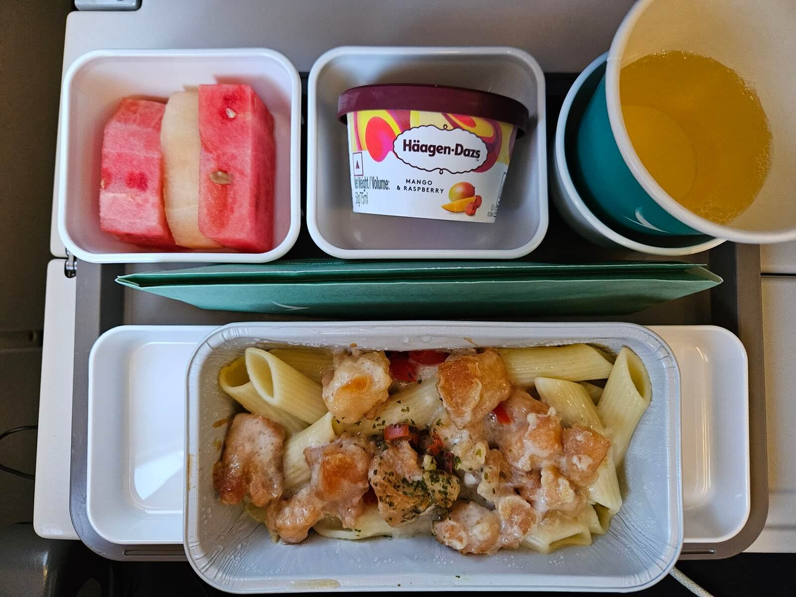 CX961 的餐點是由杭州上餐,我選了雞肉意麵,打開的時候愣了一下,想說自己怎麼會想成鹽水意麵。整體而言筆管麵偏乾同時雞肉也偏老,而且吃完底下有一層油,表現有點慘烈。