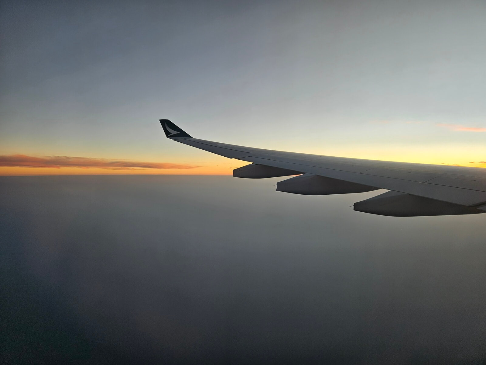 用完餐不久飛機開始下降,正值日落時分,遠方天際染上一抹橘黃。
