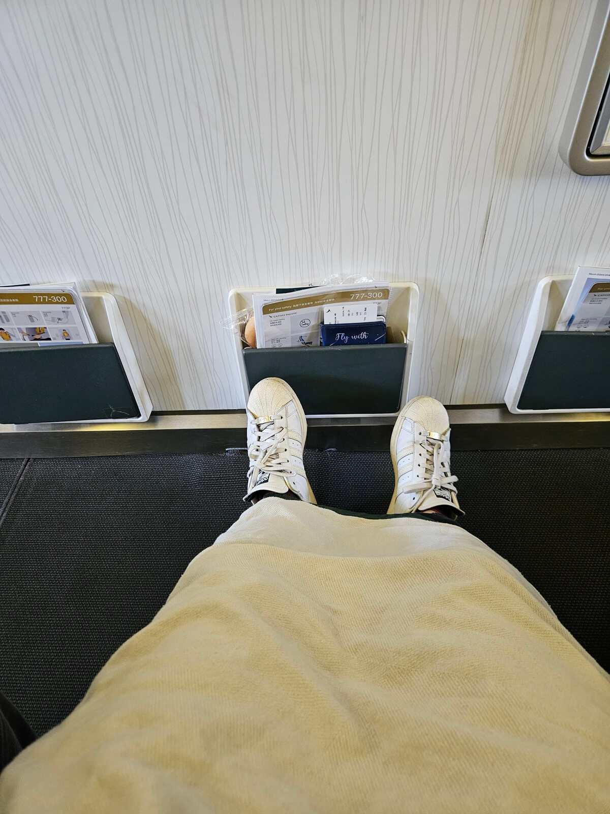 航班於 8:35 準時開始登機,一到位子,我們的座椅上已經提前放好枕頭跟毯子,再次感謝國泰的貼心。