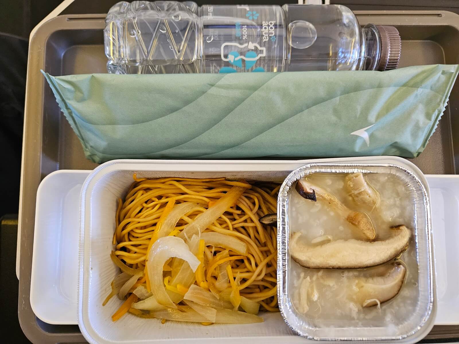 起飛後 20 分鐘,我拿到本次的飛機餐炒麵 + 雞肉粥。出發前幾天在臉書社團「航空膳食藝術社區」,有看到社友分享說這個餐不好吃。自己的感想是粥帶著淡淡的鹹味,裡面的雞肉偏老但整體是好吃的。至於炒麵雖然底下有醬汁,然而吃起來沒什麼味道,真的不太行。