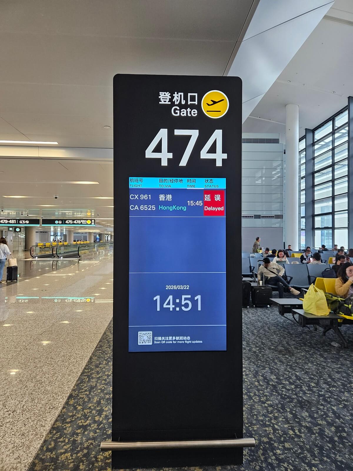中間我有詢問地勤,得到的回覆是很有可能趕不上 19:40 回台北的 CX464。15:55,機場廣播 CX961 延誤到 16:40 出發,最後航班於 16:05 開始登機,App 上更新後的預計抵達時間為 19:15。