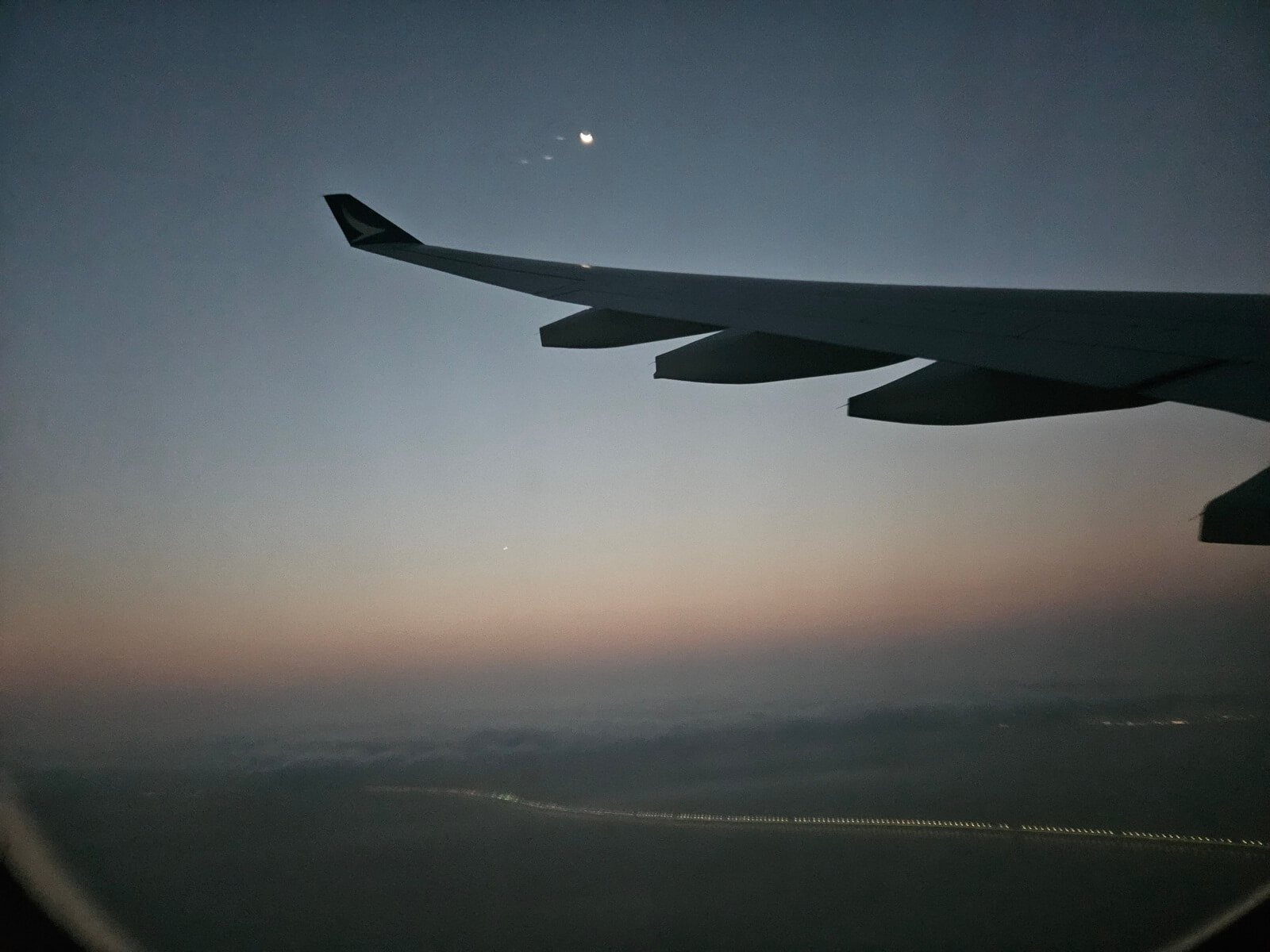 用完餐不久飛機開始下降,正值日落時分,遠方天際染上一抹橘黃。