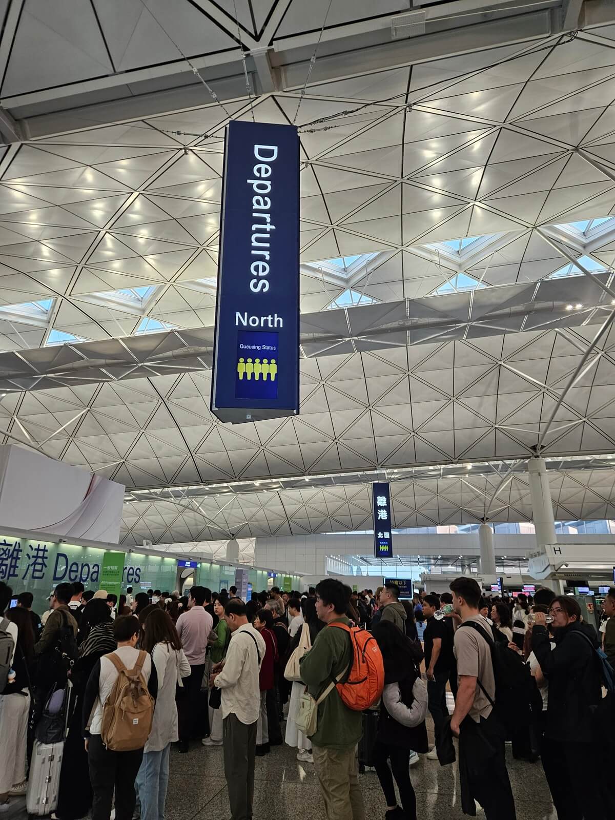 和去年五月從廈門出發時一樣(請見飛行紀錄),進入航廈之前要進行防爆檢查。國泰航空使用的 K 行段位在第四航廈國際、港澳台出發層的中間區域,地勤由當地的地勤公司代理。