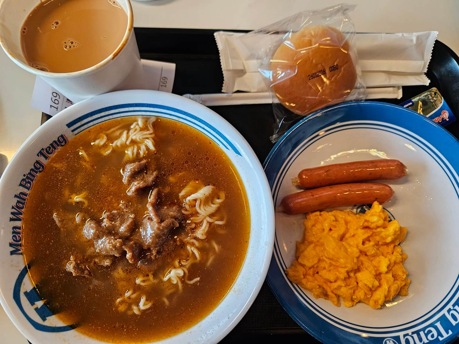 找到位子後,我點了心心念念的沙嗲牛肉麵,附餐包含雙腸炒蛋、牛油餐包,以及一杯熱飲(凍飲要 +3)。配上凍奶茶總共 64 元港幣,感謝國泰招待。