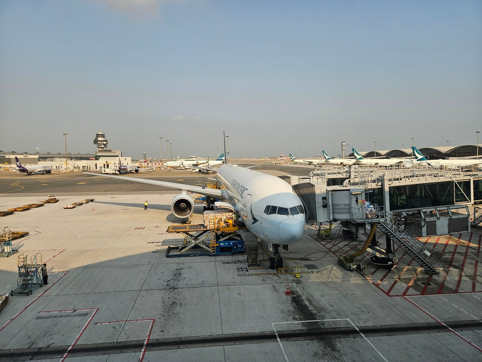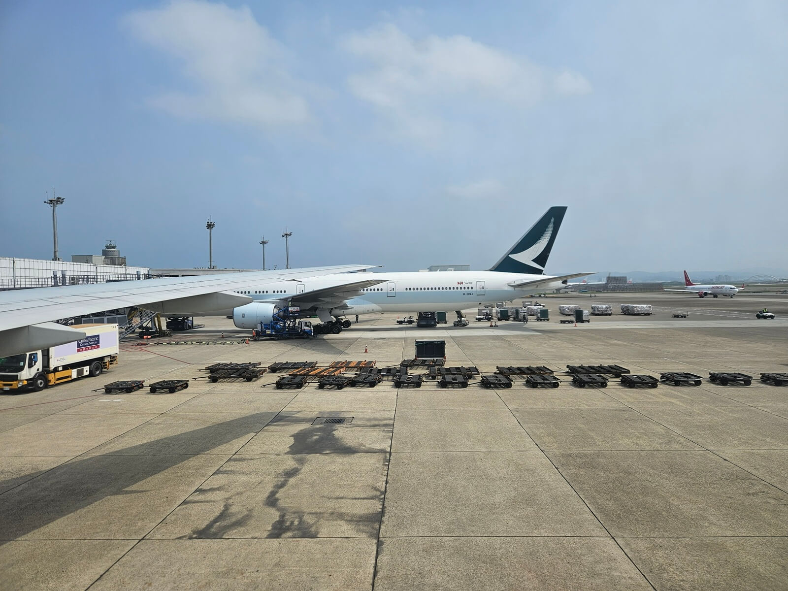 到達真正的 42 號登機門,這天執飛 CX530 的 B-HNO 正在進行地面作業,晚點帶我們抵達台北之後,B-HNO 會再以同樣的 CX530 班號延遠至名古屋。