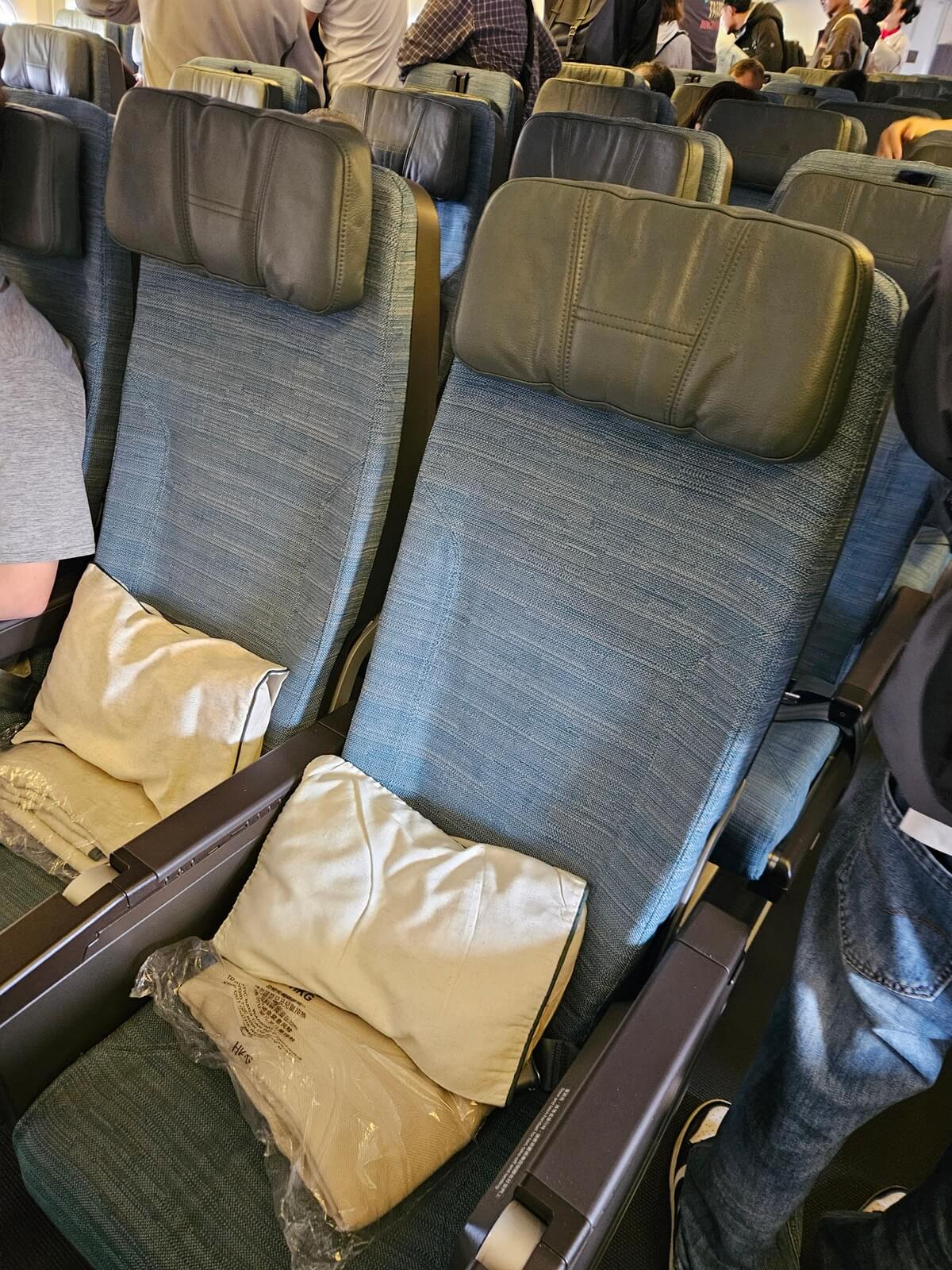 航班於 8:35 準時開始登機,一到位子,我們的座椅上已經提前放好枕頭跟毯子,再次感謝國泰的貼心。